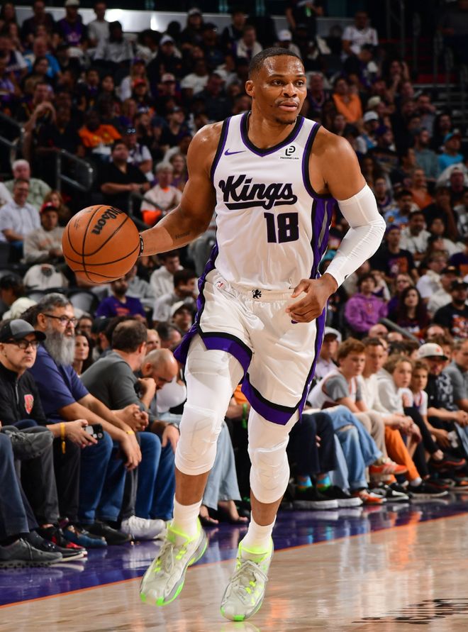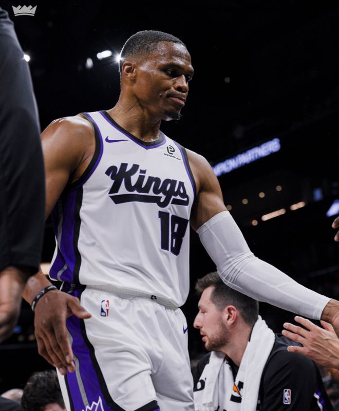 這場比賽是拉塞爾-威斯布魯克在國王隊的首秀,此前的季前賽他一場都沒打,他在首節(jié)還剩5分鐘時替補登場,他是打施羅德的替補,可登場后兩個中投都未能命中,首節(jié)0分,他國王的第一分來自第二節(jié)的一次籃下2+1,可這一球后他又是一波3中0,僅僅半場6中1拿3分5籃板1助攻1蓋帽。