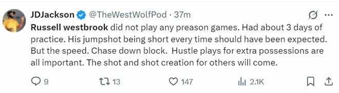 國王記者JD-杰克遜:威少沒有打任何季前賽,只參與了大約三天的球隊合訓,他的跳投每次都短了,這是意料之中的事情。但他的速度、搶斷、封蓋以及拼搶的態(tài)度可以為球隊爭取更多進攻機會,在為隊友創(chuàng)造投籃機會上威少未來也會展現出一定的優(yōu)勢。