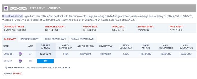 威少363萬只占用229萬的薪金空間,而且威少這份底薪是不保障性合同,國王一旦覺得他表現不佳隨時可以裁掉他。