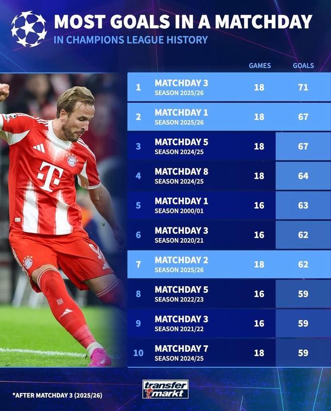 歐冠歷史單輪進球數(shù)前10:本賽季第3輪71球第1,第1輪67球第2